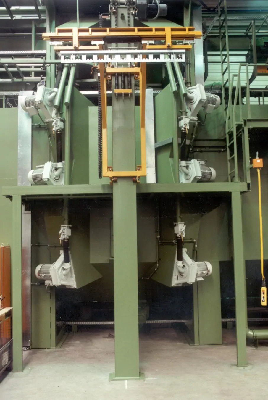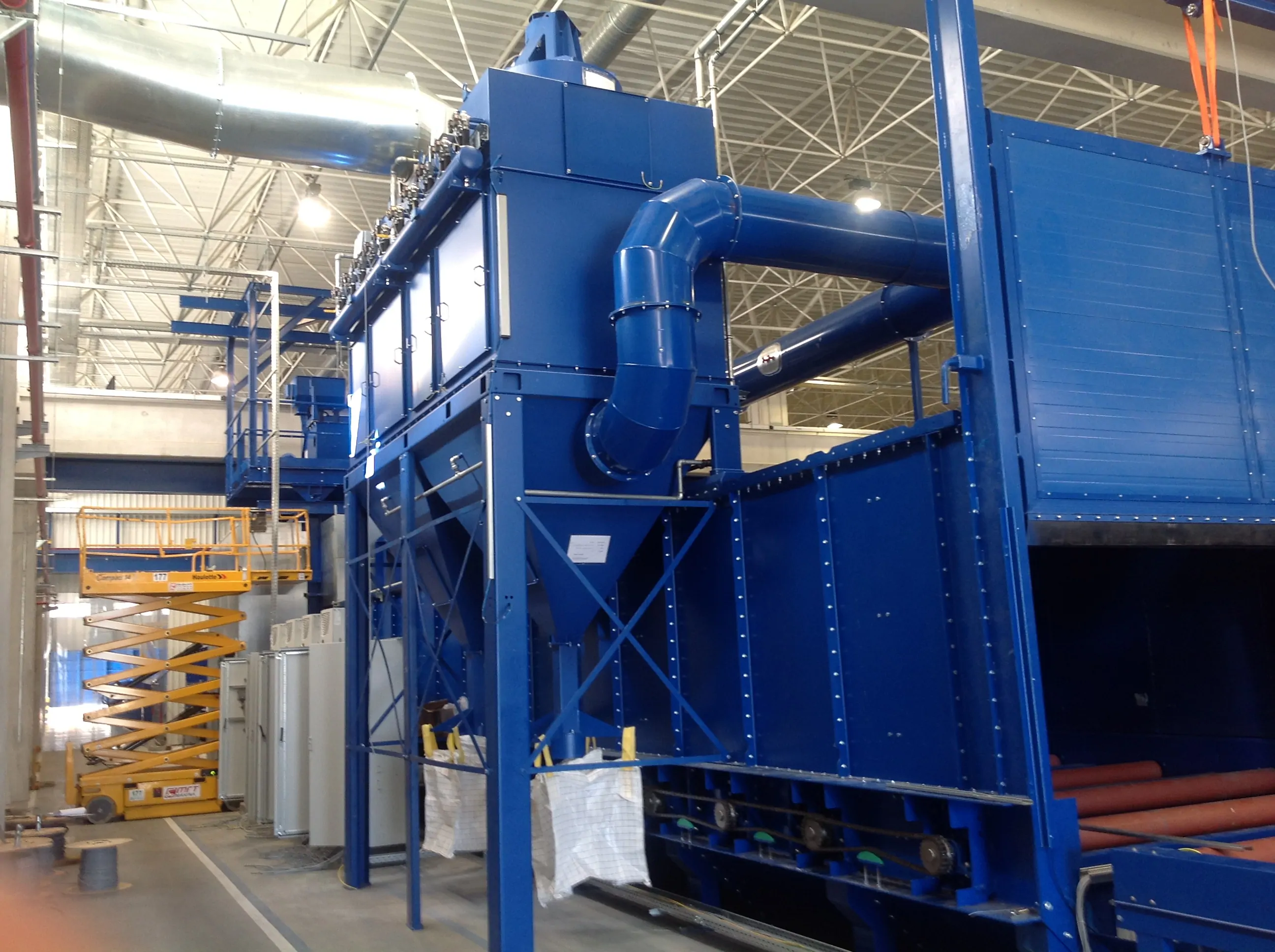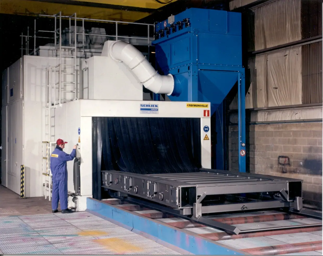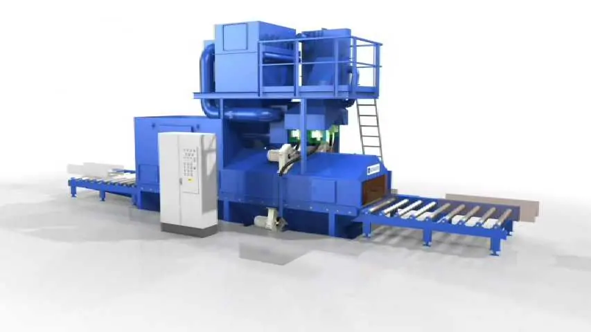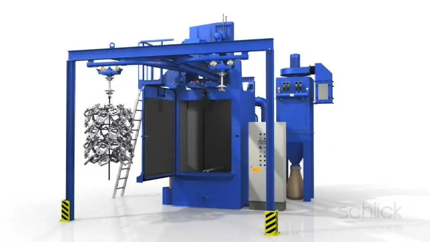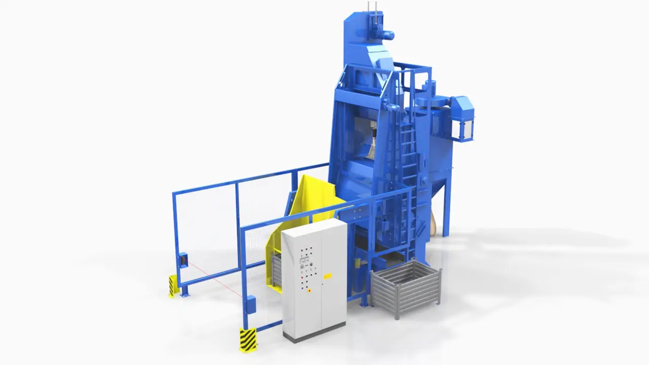 TEAM Kumlama Makinaları Askılı kumlama makinası satış ,montaj yedek parça ihitiyaçlarınızı karşılar .Dilerseniz asklı kumlama makinanızın modernizasyonu periyodik bakımını yapabilir uzamn kadromuzdan teknik destek alabilirsiniz. Team Kumlama Askılı Kumlama Makinesinin çalışması ile birlikte temizleme işleminin yapılacağı hazneye koyulan parçalar türbinler sayesinde yüzey temizlenir.Tozlu çelik bilyalar elevatöre dökülür. Elevatör makine içine dökülen çelik bilyaları seperatöre taşır.Dökülen çelik bilyalar tozdan ayrıştırılır. Bu sayede türbinlere tekrar tozsuz çelik bilya aktarılır.